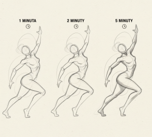 1 minuta: načrtněte jen osu těla, směr končetin, náklony.